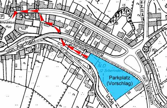 Die Parksituation auf Korneliusmarkt/Benediktusplatz kann keinen Einwohner Kornelimünsters befriedigen. Hier sollten seitens der Verwaltung und der politischen Kräfte endlich ausführbare Pläne entstehen. Die Argumente der Wasserbehörden zu einem Parkplatz auf dem Panacker scheinen nicht mehr stichhaltig zu sein, wenn man die gewerbliche Bebauung im Bereich des oberen Panackers/des früheren Gaswerks berücksichtigt. Von diesem anzulegenden Parkplatz wäre ein guter Zugang über einen Fussweg (gepunkte Markierung) unter der Strassenbrücke hindurch zum Ortszentrum möglich und das Ortsinnere wäre deutlich entlastet. Das Hauptargument der Behörde war, dass der Panacker als Überflutungsfläche erhalten bleiben müsse. Was spricht gegen einen Parkplatz mit Rasengittersteinen, der in Hochwasserzeiten nicht benutzbar ist? In vielen Orten mit gelegentlicher Hochwassergefahr (z.B. Flussufer) wird diese eingeschränkte Nutzung seit langem praktiziert. Es müsste also auch in Kornelimünster eine ähnliche Lösung zu erreichen sein. Wir sind sehr interessiert, was unsere Leser zu einem derartigen Ausbau meinen. Der Vorschlag ist eine Diskussionsgrundlage für die Zukunft! Schreiben Sie uns. zurück nach oben |
