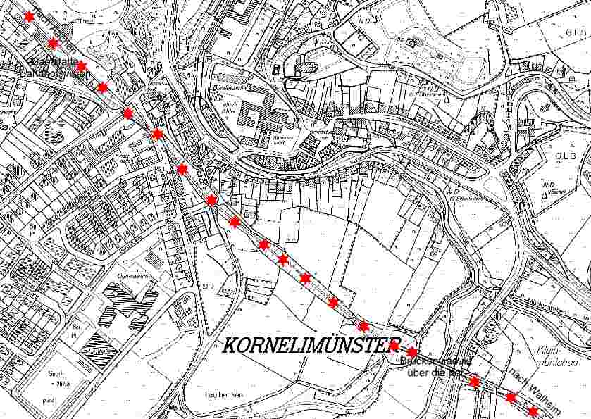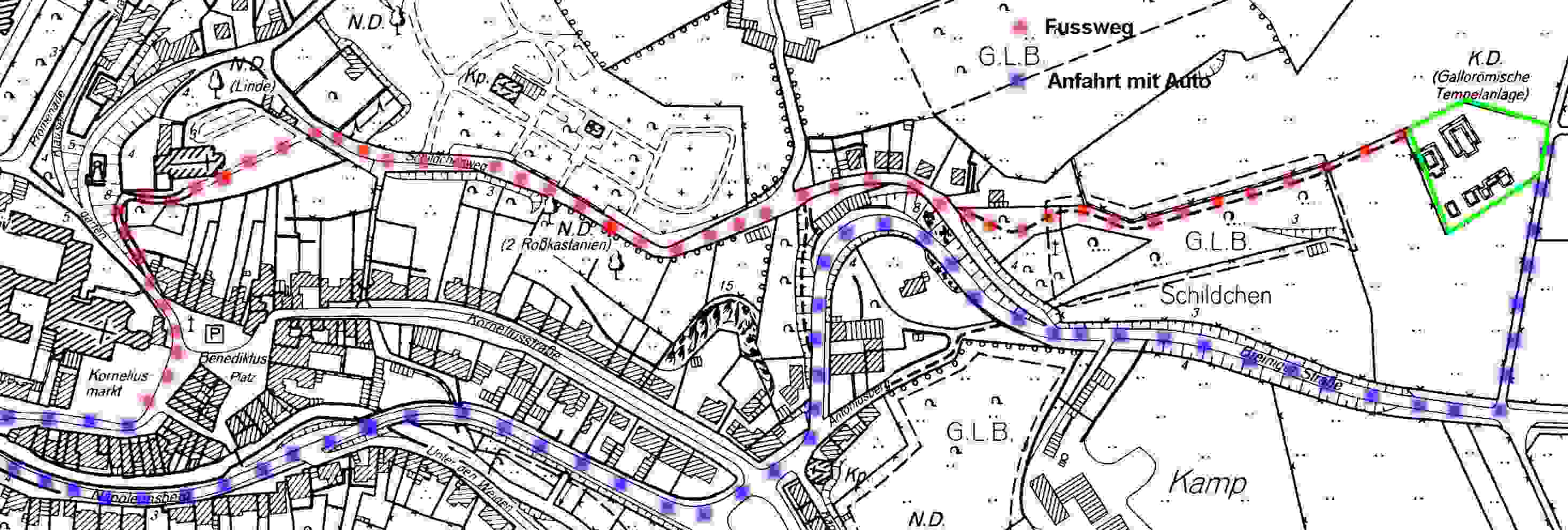 ![]() Fussweg nach Varnenum vom Fuss der Treppe zur Bergkirche aus (rote Punkte) bzw. Anfahrt mit dem Auto (blaue Punkte). |