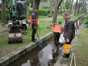 Das im Herbst gefallene Lindenlaub wird mit Kräften des Stadtbetriebs aus dem Becken und dem Kanal geräumt.